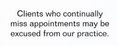 As a courtesy to myself and my other clients, please remember to call us as soon as you know that you will not be able to keep your scheduled appointment and we would be happy to rebook you.